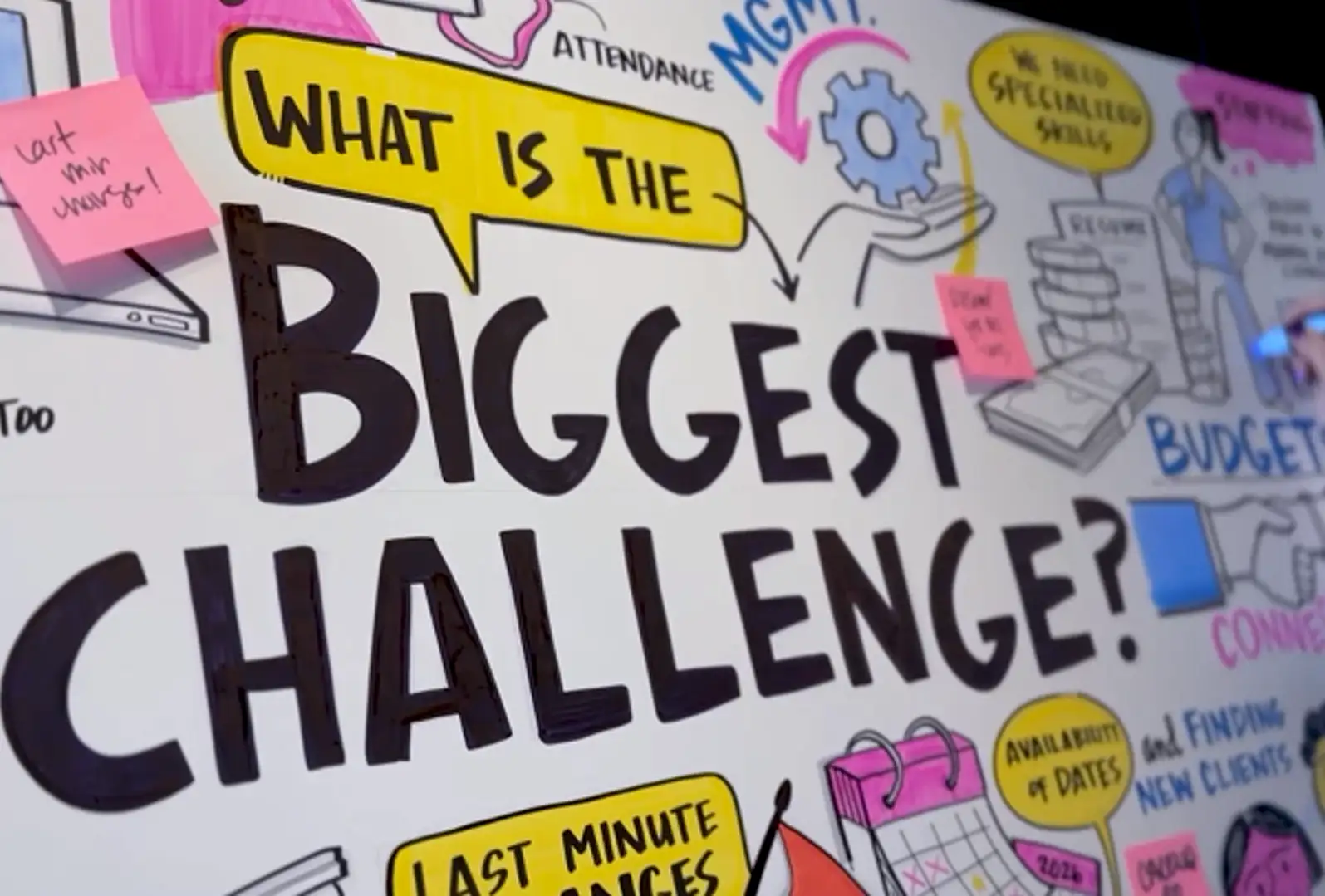 From 5,000-person conferences to intimate gatherings, our team of artists transforms audience voices into real-time visuals that spark participation, amplify engagement, and give you actionable insights you can actually use.